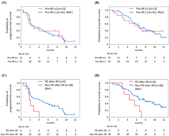 When comparing patients who previously received irinotecan (Pre-IRI(+), n = 13) to irinotecan-naïve patients (Pre-IRI(−), n = 41), no significant differences in PFS and OS were found between the two groups (Figure 3A,B). The median PFS periods were 2.8 months (95% CI 0.2–5.4) in Pre-IRI(+) patients and 3.7 months (95% CI 0.9–6.5) in Pre-IRI(−) patients (HR 1.1, 95% CI 0.5–2.1, p = 0.86). The median OS periods were 6.7 months (95% CI 2.8–N.R.) in Pre-IRI(+) patients and 6.5 months (95% CI 5.0–10.0) in Pre-IRI(−) patients (HR 1.01, 95% CI 0.43–2.15, p = 0.97), respectively. However, patients with disease progression after irinotecan-containing chemotherapy had shorter PFS and OS than other (Pre-IRI(−) and Pre-IRI(+) without disease progression) patients (Figure 2C,D). The median PFS periods were 1.9 months (95% CI 1.2–4.0) in patients with disease progression after irinotecan-containing chemotherapy and 4.1 months (95% CI 2.0–6.0) in other patients (HR 2.83, 95% CI 1.04–6.56, p = 0.017), respectively. The median OS periods were 5.0 months (95% CI 2.8–7.1) in patients with disease progression after irinotecan-containing chemotherapy and 7.8 months (95% CI 5.2–11.3) in other patients (HR 2.58, 95% CI 0.95–5.98, p = 0.033). A multivariate analysis showed patients with PD after irinotecan had significantly worse PFS compared with patients with non-PD after irinotecan (HR 2.84, 95% CI 1.10–7.37, p = 0.03). Although not statistically significant, OS tended to be worse in patients with PD after irinotecan compared with other patients (HR 2.50, 95% CI 0.96–6.47, p = 0.06). Patients with high NLR (NLR > 5) had worse PFS (HR 2.60, 95% CI 1.06–6.40, p = 0.04) and OS (HR 3.38, 95% CI 1.22–9.32, p = 0.02) compared with other patients (NLR ≤ 5). Good performance status (ECOG PS 0) was significantly related to better PFS (HR 0.43, 95%CI, 0.23–0.83, p = 0.01), but not significantly associated with OS (HR 0.51, 95% CI 0.24–1.12, p = 0.09) (Table 7).
