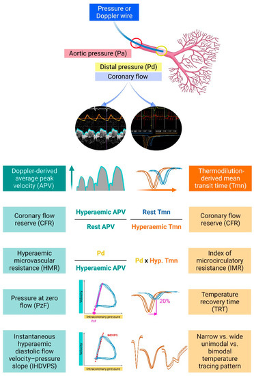 Although TIMI flow <3 is intuitively associated with impaired reperfusion at the level of microcirculation and it is a recognized predictor of adverse events following primary PCI [19], the very low rate of such angiographically documented no-reflow of <5% is not commensurate with the findings from both experimental and clinical studies with the evidence of CMD in half of patients with STEMI having TIMI 3 at the end of the procedure [9,20]. Hence, using TIMI classification to describe epicardial flow and by extension estimate the presence of CMD may be the accessible tool in the catheterization laboratory, albeit grossly underestimating its true frequency. Myocardial blush grade (MBG) that relies on the assessment of angiographic contrast density in the distal territory of an epicardial artery has been used as a surrogate of the microvascular reperfusion, and it has been shown to predict mortality after primary PCI independently of the TIMI flow [21]. Although MBG did correlate to a certain degree with CMR-based MVO, much like the other angiographic surrogate, TIMI flow, it still failed to detect a considerable portion of patients with signs of microvascular injury on CMR [20,22]. Going beyond angiographic markers, such as TIMI flow and MBG, invasive assessments of coronary microcirculation have been used to assess microcirculatory function. Recently, increased coronary wedge pressure (CWP > 38 mmHg), as measured through a microcatheter advanced distally to the occlusion site and before culprit artery recanalization, was associated with adverse LV remodeling over 60 months follow-up after STEMI [23]. Wire-based assessments of flow velocity with either a Doppler or thermodilution method after epicardial flow restoration have been shown to correlate well with the CMR-based detection of microvascular damage. In principle, wire-based methods have the capability to measure pressure in the distal coronary artery and flow, either as flow velocity (Doppler) or as mean transit time (thermodilution method), under resting and hyperemic conditions. Combining simultaneous pressure and flow measurements, several indices of microvascular function have been developed (Figure 2) including coronary flow reserve (CFR), index of microcirculatory resistance (IMR), hyperemic microvascular resistance (HMR), instantaneous diastolic flow velocity-pressure slope (IHDVPS) and pressure at zero flow (PzF).