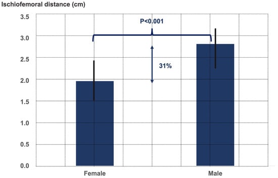 Values were presented as the mean and standard deviation. A comparison was performed using Analysis of Variance (ANOVA), where the data was distributed parametrically. Linear regression was performed to test the influence of input variables on the ischiofemoral distance. A p-value of <0.05 was considered statistically significant. Statistical tests were performed using IBM SPSS Statistics version 27 (Armonk, New York, NY, USA).