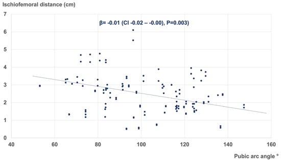 Multivariate linear regression analysis revealed several morphometric parameters influencing the ischiofemoral space of the hip. These included the pubic-arc angle (β = −0.01 (CI −0.02–−0.00),