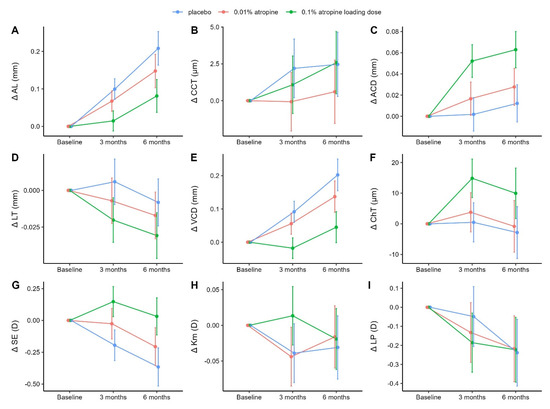 Diagrams showing changes in ocular biometrics and refractive parameters from baseline to six-month visit with placebo (blue), 0.01% atropine (red), and 0.1% atropine loading dose (green). Mean values are indicated by dots, whereas vertical error bars indicate the 95% CIs of the mean changes. Means and CIs were derived from the constrained linear mixed model with inherent baseline adjustment. (A), Change in AL in treatment groups over six months. (B), Change in CCT in treatment groups over six months. (C), Change in ACD in treatment groups over six months. (D), Change in LT in treatment groups over six months. (E), Change in VCD in treatment groups over six months. (F), Change in ChT in treatment groups over six months. (G), Change in SE in treatment groups over six months. (H), Change in Km in treatment groups over six months. (I), Change in LP in treatment groups over six months. Abbreviations: Δ = change in; ACD = anterior chamber depth; AL = axial length; CCT = central corneal thickness; ChT = choroidal thickness; CI = confidence interval; D = diopters; Km = mean anterior corneal curvature; LT = lens thickness; LP = lens power; SE = spherical equivalent; VCD = vitreous chamber depth.