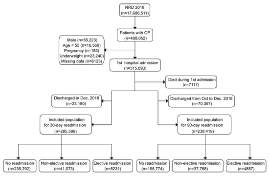 We estimated the burden of hospitalized postmenopausal women concomitant with osteoporosis in view of the rates of unplanned 30- and 90-day readmissions, and associations between metabolic obesity phenotypes and readmissions. We included hospitalized female patients above 55 years old diagnosed with primary osteoporosis according to the ICD-10-CM codes, containing M80 and M81 (Table S1). We excluded patients who were underweight (BMI < 20) or died during their initial hospitalization. Individuals with missing data of baseline characteristics were also excluded. Considering that patients from one calendar year cannot be tracked to the previous or next year, patients discharged during December (Dec) were excluded from the 30-day readmissions study. Similarly, patients discharged during October (Oct) to Dec were not taken into study for 90-day readmissions.