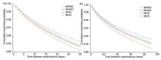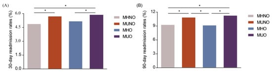 Compared to the MHNO group, the MUNO group had a significantly higher rate of 30-day readmission (5.7% vs. 4.9%, p < 0.05), the MUO group had a higher 30-day readmission rate than that of the MHO group (5.9% vs. 5.2%, p < 0.05), and no statistical differences were found between the MUNO and MHO participants (Figure 2A). A higher proportion of MUNO patients was readmitted to hospital at 90 days, compared to that of MHNO patients (10.9% vs. 9.3%, p < 0.05), even higher than that of the MHO group (10.9% vs. 9.2%, p < 0.05) (Figure 2B). The MUO group had a higher 90-day readmission rate than the MHO group (11.3% vs. 9.2%, p < 0.05) (Figure 2B). There were no differences in 30- or 90-day readmission incidence among the subgroups of metabolically healthy (MHO vs. MHNO) or metabolically unhealthy (MUO vs. MUNO) (Figure 2A,B).
