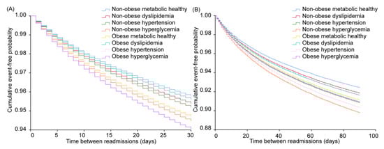 Cumulative event-free probability of obesity categories with/without specific metabolic disorder among hospitalized postmenopausal osteoporotic women. (A) The 30-day and (B) 90-day readmission of different obesity categories with/without specific metabolic disorder subgroups among hospitalized postmenopausal women concomitant with osteoporosis, including non-obese metabolic healthy, non-obese dyslipidemia, non-obese hypertension, non-obese hyperglycemia, obese metabolic healthy, obese dyslipidemia, obese hypertension, and obese hyperglycemia.