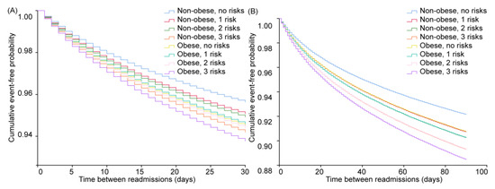 Cumulative event-free probability of number of MS disorders among hospitalized postmenopausal women concomitant with osteoporosis. (A) The 30-day and (B) 90-day readmission of subgroups of number of MS disorders among hospitalized postmenopausal women concomitant with osteoporosis, including non-obese with no risk factor, non-obese with 1 risk factor, non-obese with 2 risk factors, non-obese with 3 risk factors, obese with no risk factor, obese with 1 risk factor, obese with 2 risk factors, and obese with 3 risk factors.