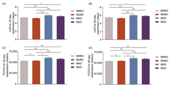 LOS and TOTCHG among metabolically obesity phenotypes during unplanned 30- and 90-day readmissions. (A) Length of stay (LOS) at 30-day readmissions, (B) LOS at 90-day readmissions, (C) total charge (TOTCHG) at 30-day readmissions, and (D) TOTCHG at 90-day readmissions. * p < 0.05, ** p < 0.01. MHNO: metabolically healthy non-obese, MUNO: metabolically unhealthy non-obese, MHO: metabolically healthy obese, MUO: metabolically unhealthy obese.
