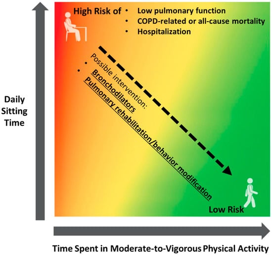 Interestingly, sedentary behavior itself might increase the risk of COPD. A large-scale, cross-sectional study of 14,073 individuals showed that those who remained sedentary for more than 7 h per day were more likely to have COPD than the control group, whose sedentary time was less than 3 h after adjustment for confounders including sex, age, country, educational level, marital status, occupation, economic status, smoking habit, physical activity, and all other chronic diseases, even though detailed physical activity levels other than sedentary time were not clarified [111]. Thus, increasing sedentary behavior time might contribute to increasing the incidence rate of COPD, along with the associated clinical outcomes.