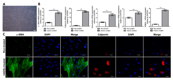 In vitro differentiation of hADScs into SMCs. (A) Optimal differentiation into SMCs was observed after two weeks when cells were cultured in smooth muscle inductive medium (low-glucose DMEM containing 0.1% gentamicin plus 5 ng/mL TGF-β). 2D-cultured hADScs in uncoated dishes grew to confluence and formed a monolayer of fibroblast-like cells presenting a flat morphology and a stress fiber pattern. (B) RT–PCR analysis of α-SMA, calponin, smoothelin, caldesmon, and SM22α levels between the hADSc-treated group and the control group after cell differentiation. (C) Immunofluorescence staining of α-SMA and calponin expression after cell differentiation. SMC, smooth muscle cell; TGF-β, transforming growth factor β; hADSc, human adipose-derived stem cell; RT-PCR, real-time polymerase chain reaction; α-SMA, α-smooth muscle actin; GAPDH, glyceraldehyde 3-phosphate dehydrogenase. Data are expressed as the mean ± SD; *** p < 0.001.