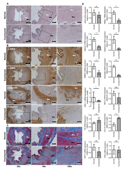 Upon confirmation of IAS-specific incontinence induced by cryoinjury, impaired muscle layers accompanying the intact submucosa, outer muscular, and serosa layers were identified via H&E and Masson’s trichrome staining in the cryoinjured group (n = 5) compared to the normal group (n = 5) (Figure 3). The disappearance of α-SMA and calponin-stained connective tissue in the impaired layer during immunofluorescence analysis confirmed cryoinjury targeting the SMCs in the IAS. RT–PCR analysis showed that SMC markers, including, SM22α, calponin, SMMHC, smoothelin, and SDF-1, were significantly decreased in the cryoinjured group compared with the normal group (SM22α, calponin, SMMHC, and smoothelin, p < 0.001; SDF-1, p < 0.05). CoL1A1 expression appeared significantly altered after cryoinjury.