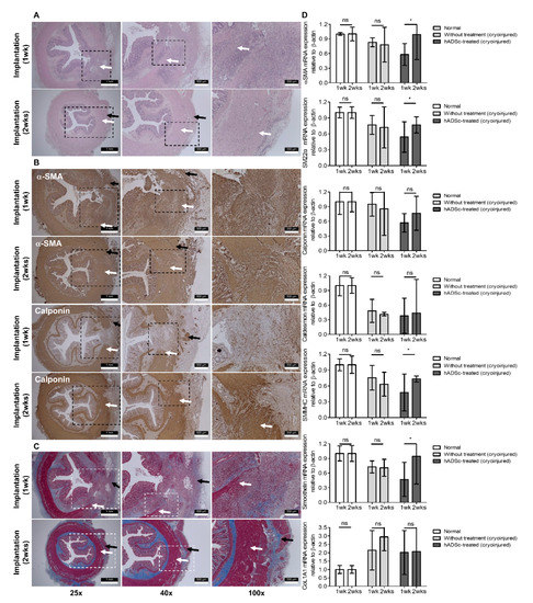 Cell treatment based on the internal anal sphincter-specific incontinence model. Histologic examination after (A) H&E staining, (B) immunofluorescence staining for α-SMA and calponin, and (C) Masson’s trichrome staining 1 and 2 weeks after hADSc implantation at the cryoinjury site (dotted line box). Histology showed the regenerated smooth muscle in the internal anal sphincter (white arrow) with intact mucosa, submucosa, and circular external anal sphincter muscle layers (black arrow). (D) RT-PCR analysis of SMC markers in the normal, without treatment (only cryoinjured), and hADSc-treated groups based on α-SMA, SM22α, calponin, caldesmon, SMMHC, smoothelin, and CoL1A1. H&E, hematoxylin and eosin; α-SMA, α-smooth muscle actin; hADSc, human adipose-derived stem cell; RT-PCR, real-time polymerase chain reaction; SMMHC, smooth muscle myosin heavy chain. Data are expressed as the mean ± SD; * p < 0.05; ns = no statistical significance.