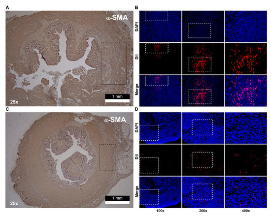 Rats were randomly assigned to the Dil-stained hADSc-treated group (n = 10), sham cryoinjury group (n = 10), and the normal group (n = 10). The sham cryoinjury group underwent intersphincteric dissection and cryoinjury without cell implantation. Rat anal sphincters were harvested as whole specimens, from the anal verge to the rectum, one and two weeks after implantation. After cryoinjured muscle layers were confirmed in the IAS ring specimens harvested from the anal sphincter (Figure 2A,C), we identified implanted cells displaying Dil staining-targeted fluorescence among host cells around the injury site, after confirming a lack of signal in normal tissue and cryoinjured tissue without treatment (Appendix A Figure A1A,B).
