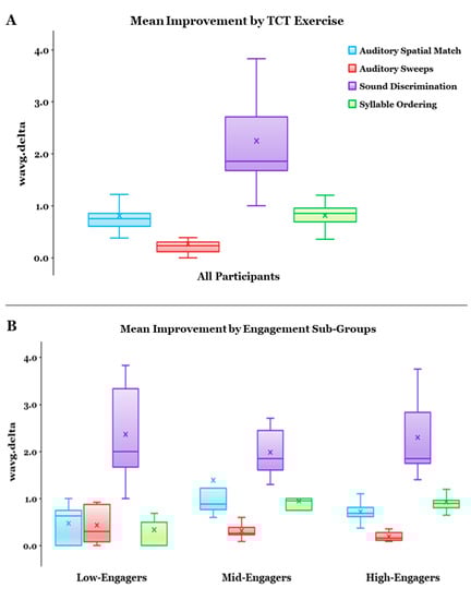 Weighted average change metrics were calculated for all participants (N = 25) who started the auditory-based TCT program regardless of whether they completed all levels of training; mean performance change (wavg.delta) on all four exercises reflected improvements from baseline: Sound Discrimination = 2.248, SD = 0.795; Syllable Ordering = 0.812, SD = 0.373; Auditory Sweeps = 0.265, SD = 0.265; Auditory Spatial Match = 0.803, SD = 0.624 (Figure 1A). In summary, 15 of the participants completed all 640 levels of the intervention program, and 10 completed some but not all levels.