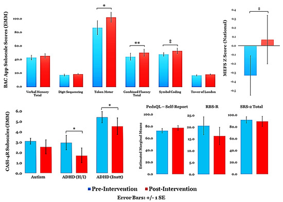 Mean pre-/post-intervention scores on clinical and cognitive assessments. Covariates appearing in the model are evaluated at the following values: Age = 17.04, Sex = 0.17. ** p < 0.01; * p < 0.05; ‡ p < 0.10 (trend).