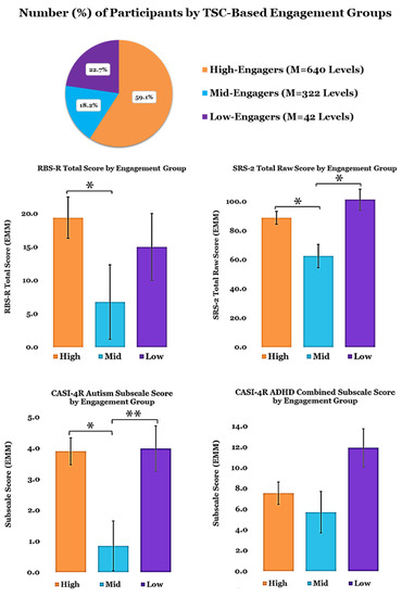 Two-Step Cluster Analysis-Based Engagement Groups (Mean Targeted Cognitive Training Levels Completed: High = 640; Mid = 322; Low = 42.8).; Baseline clinical assessment scores by Engagement Sub-Grouping. Covariates appearing in the model are evaluated at the following values: Age = 17.0, Sex = 0.18. Error Bars = ±1 SE; ** p < 0.01, * p < 0.05.