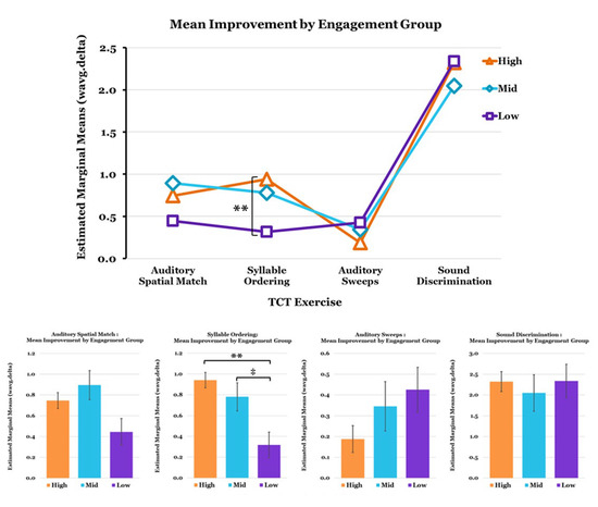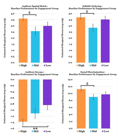 Mean baseline TCT exercise performance by Engagement Group (Mean Levels completed: High = 640; Mid = 322; Low = 42.8). Note that negative values on the performance metric for Auditory Sweeps exercise indicate better performance (faster auditory processing speed). Covariates appearing in the model are evaluated at the following values: Age = 17.0, Sex = 0.18. Error Bars = ±1 SE; ** p < 0.01, ‡ p < 0.10 (trend).