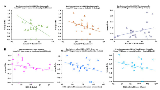 Controlling for age and sex, our analysis of the relationships between baseline SCAN FW raw scores and mean improvement in performance yielded significant partial correlations for the Auditory Spatial Match (r = −0.449, p = 0.024) and Syllable Order exercises (r = −0.397, p = 0.041). A significant partial correlation was also found for the relationship between baseline SCAN CW raw scores and mean improvement in performance on Auditory Sweeps (r = 384, p = 0.047) (Figure 6A). Trend level correlations were found for the relationships between mean improvement on the Auditory Spatial Match exercise and clinical measures at baseline, including the SRS-2 Social Communication and Interaction (SCI) factor (r = −0.370, p = 0.054) and the RBS-R Total Score (r = −0.345, p = 0.068) (Figure 6B).