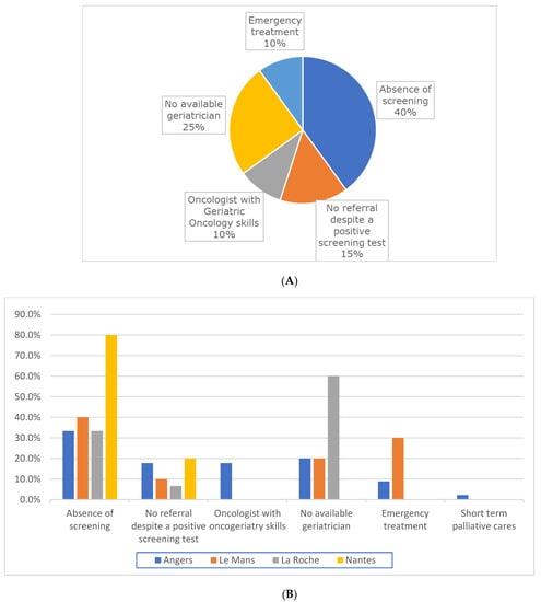 (A) Reasons for the absence of geriatric evaluation in the total population (N = 80). (B) Reasons for the absence of geriatric evaluation in each study center.
