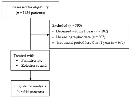 Extraction of data from the clinical data warehouse (CDW) of a single institute with a high-volume hematology hospital and a dental hospital, data of a total of 1434 patients who were diagnosed with multiple myeloma (ICD-10 C90, C900 with confirmed diagnosis) and treated with bisphosphonates (intravenous pamidronate or zoledronate) in periods January 2009 through December 2019 were obtained, then assessed for eligibility. Patients who deceased within one year of diagnosis, were treated with bisphosphonates for less than one year, had a previous history of treated osteoporosis, were ever treated with other class agents (e.g., denosumab), or had insufficient radiographic/clinical data were excluded from the study. Medical charts, including dental records, were retrospectively reviewed, then plain anteroposterior and lateral view femur radiographs with supplementary bone scan images were thoroughly reviewed by three orthopedic surgeons for 644 eligible patients who met the criteria (Figure 1).