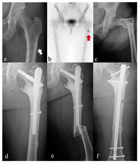 Anteroposterior view radiographs of the left femur (a,c–f) and a bone scan image (b) of two consecutive AFFs (arrows) occurred in a patient treated with high-dose bisphosphonates. (AFF: atypical femoral fracture).