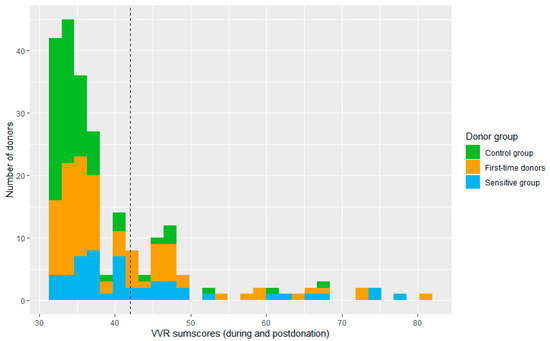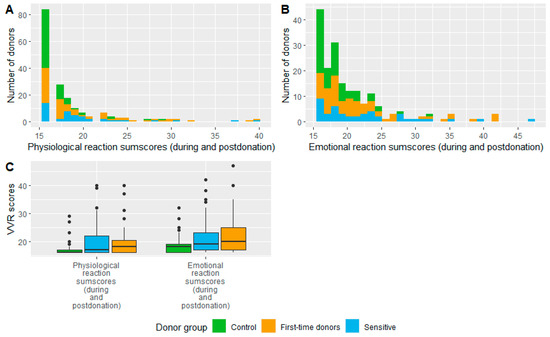 The same pattern was found using one-way ANOVA with the total score of negative emotional ratings during stage 4–7 (F(2) = 8.499, p < 0.001) where the control group experienced significantly lower levels of adverse emotions than the sensitive (p < 0.001) and new donors (p < 0.002) groups, but no significant differences were found between sensitive and new donor groups (p = 0.81, Figure 1C). Figure 1A,B show the distribution of the sum scores on both physiological and emotional reaction levels. As the pattern of the results are very similar, we combined the scores together and analyzed the results further using an overall score, referred to as the VVR score.