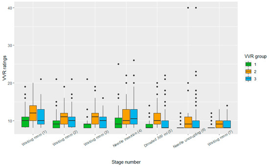 Distribution of VVR ratings per stage and group. The dots above the box represent the outliers per group.