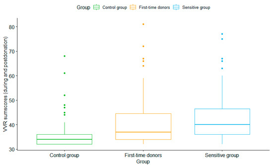 Variation in total VVR scores (during stages 4–7) per group. VVR symptoms consist of faintness, dizziness, weakness and lightheadedness, fear, stress, tension, and nervousness. The line in the box represents the mean of each group and the dots above the box represent the outliers per group.