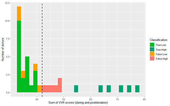 Models that only included the self-reported pre-donation VVR scores already showed a good performance, with F1 scores varying from 0.69 to 0.77. However, a much better predictive performance (F1 score = 0.82) was achieved by looking at the facial action unit intensities using a neural network algorithm (see Table 1). Figure 5 shows where the model made errors in the classification, which shows that this model was able to correctly classify all donors who reported high VVR levels on the test set (see yellow bars in Figure 4). The performance was less good for donors whose VVR levels were around the cut-off point. As can be seen by the green bars in Figure 5, some donors scored around the midrange in terms of vasovagal reactions (between 42 and 50 points).