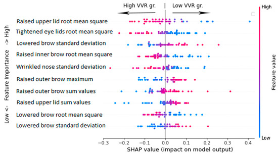 The most important predictors in the best performing model were those located in the mid and upper regions of the face, including movement in the eyelids (raising the upper lid, tightening the eyes), movement in the eyebrows (related to moving the brows up and down), and wrinkling the nose (Figure 6). For example, the most important feature of the ‘root mean square’ of the intensity of a raised upper lid can be interpreted such that the strength of upper eyelid intensity was the most important feature in differentiating between low and high VVR groups. In simple terms, the more raised and tightened the upper eyelid was over time, the more likely the model was to classify a person as being in a high-risk VVR group.