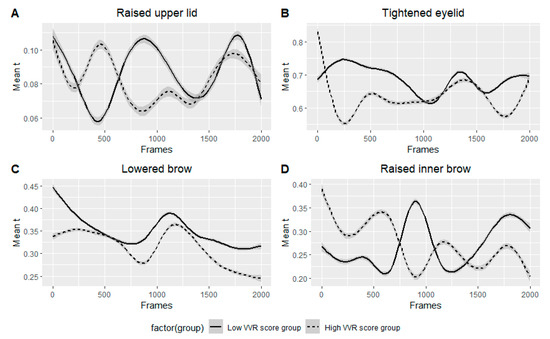 A smoothed visual representation of the mean intensity of the four most predictive action units between low and high VVR groups during the 2000 frames prior to the donation. (A) shows the mean intensity value of raised upper eyelid, (B) shows the mean intensity value of tightened eyelid, (C) shows the mean intensity value of lowered eyebrow, and (D) shows the mean intensity value of raised inner eyebrow.