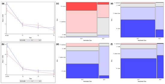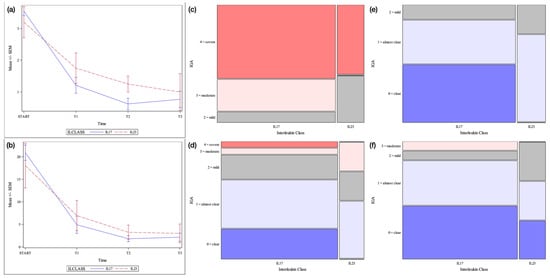 Erythrodermic psoriasis cohort. Legend: (a) = Mean +/− SEM IGA score by time point and interleukin class. SEM = Standard error of the mean (b) = Mean +/− SEM PASI score by time point and interleukin class (c) = Mosaic plot of IGA scores by interleukin class: baseline (d) = Mosaic plot of IGA scores by interleukin class: week 12 (e) = Mosaic plot of IGA scores by interleukin class: week 24 (f) = Mosaic plot of IGA scores by interleukin class: week 48.