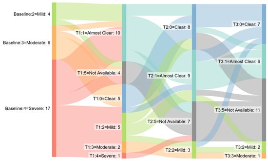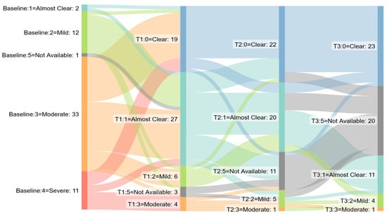 Sankey diagram: GPPGA/PPPGA score by time point in pustular psoriasis cohort. T1 = week 12, T2 week 24, T3 week 48.