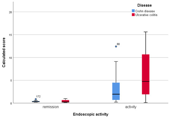 Using the Kolmogorov–Smirnov test, we noticed that the obtained scores did not have a normal distribution (p < 0.001). As a result, we compared the distribution and median values for each condition, in remission versus activity. Table 7 shows the median and the 25% and 75% percentiles, while Figure 2 shows the median of the calculated score for each disease.