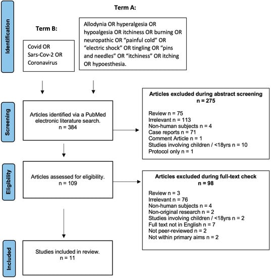 A systematic literature search in the PubMed database was performed on 16 May 2022 using two medical subject heading terms that had to be present in the title or the abstract. Term A was “Allodynia OR hyperalgesia OR hypoalgesia OR itchiness OR burning OR neuropathic OR ‘painful cold’ OR ‘electric shock’ OR tingling OR ‘pins and needles’ OR itchiness OR itching OR hypoesthesia” and term B was “COVID or SARS-CoV-2 or Coronavirus”. Human subjects, the English language and full-text filters were applied. The reference lists of eligible papers and relevant reviews were also meticulously searched to include further studies reporting on neuropathic pain related to COVID-19.