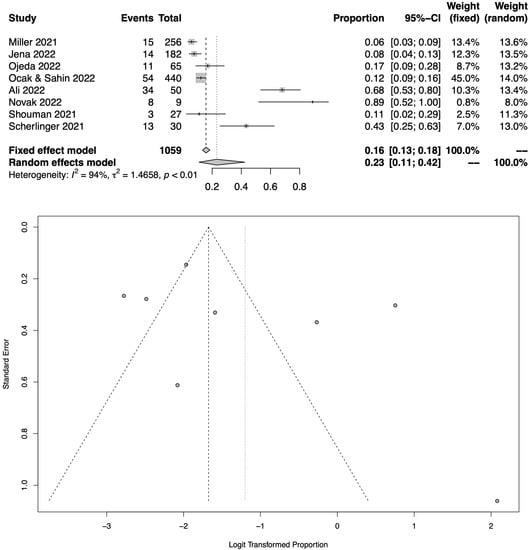 Figure 2 shows the total pooled prevalence of COVID-19-related neuropathic pain in COVID-19 sufferers following the meta-analysis of 8 eligible studies [,,,,,,,], which assessed a total of 1059 patients. The pooled prevalence of neuropathic pain was 23.2% (95% CI: 11.0–42.4%). As also shown in the respective funnel plot (Figure 2), the heterogeneity was high amongst these studies (I2 = 94%).