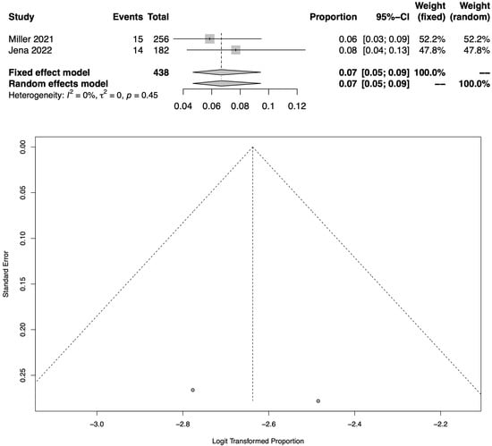 Figure 3 shows the total pooled prevalence of COVID-19-related neuropathic pain in hospitalised patients following the meta-analysis of 2 eligible studies [,], which assessed a total of 438 patients. The pooled prevalence during hospitalisation (acute phase of COVID-19) was 6.7% (95% CI: 4.7–9.5%). As also shown in the respective funnel plot (Figure 3), there was a high heterogeneity across these studies (I2 = 0.0%).