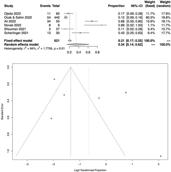 Figure 4 shows the total pooled prevalence of COVID-19-related neuropathic pain in long COVID patients following the meta-analysis of 6 eligible studies [,,,,,], which assessed a total of 621 patients. The pooled prevalence of COVID-19-related neuropathic pain in long COVID patients was 34.3% (95% CI: 14.3–62%). As also shown in the respective funnel plot (Figure 4), the heterogeneity was high amongst these studies (I2 = 94%).