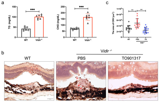 3.7. LXR Agonist Reduces the CNV Volume in Vldlr−/− Mice