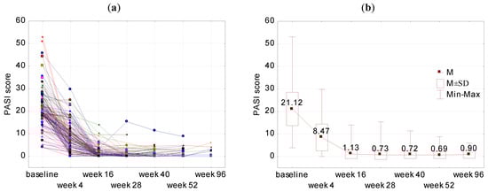 Changes in the PASI at weeks 4 (N = 136), 16 (N = 145), 28 (N = 100), 40 (N = 93), 52 (N = 62), 96 (N = 22). (a) PASI score in all study participants and (b) the mean PASI score with standard deviation (SD) during study timepoints. p < 0.001 for PASI at weeks 4, 16, 28, 40, 52 and 96 in all the comparisons to the baseline. p for Student’s t test for paired data.