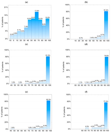 The percentage decrease in PASI at weeks (a) 4 (N = 136), (b) 16 (N = 145), (c) 28 (N = 100), (d) 40 (N = 93), (e) 52 (N = 62) and (f) 96 (N = 22) compared to the baseline.