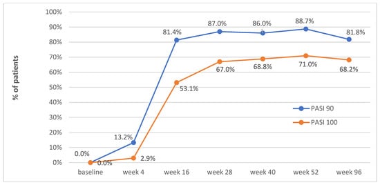 In clinical trials, PASI90 at week 16 was achieved by 73.8–75.3% of patients compared to 81.4% in our study [,]. In our patients, the mean PASI at week 16 was reduced from 21.12 to 1.13. It is worth noting that contrary to other real-life studies, in our study the percentage of patients achieving the PASI90 response at week 16 was higher than in clinical trials. This could be explained by the lower baseline PASI values in real-life studies than in clinical trials, and also by the fact that the real-life studies may include patients with limited skin involvement, so called “difficult-to-treat sites” (e.g., the scalp, palms and soles or anogenital region). As a matter of fact, the mean baseline PASI in our group was 21.12, which is almost the same as in UltIMMa-1 and UltIMMa-2 studies (20.6 and 20.5, respectively) []. On the other hand, i.e., Gargiulo et al. analyzed patients with a mean PASI of 13.52 and observed a lower PASI90 response rate (55.7%) at week 16 []. The same was observed by Mastorino et al., who found even lower PASI90 response rates (53%) but recruited subjects with a mean PASI of 12.5 ± 5.1 []. Importantly, the efficacy outcomes analyzed at later timepoints (weeks 40, 52 and 96/104) were much higher and more comparable to those from clinical trials (Table 4). For instance, in our study, at week 52, PASI90 and PASI100 was achieved in 88.7% and 71% of the study subjects, respectively, which is comparable to other studies. Treatment response was maintained until week 96, with PASI90 and PASI100 observed in 81.8% and 68.2% of the studied patients, respectively, which was almost the same as that noted by Gargiulo et al. at week 104 (80.8% and 69.2%, respectively) [].