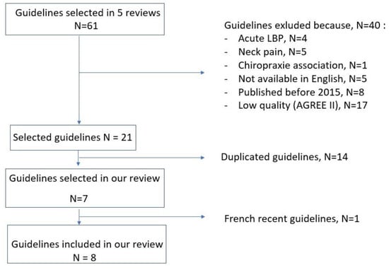 We searched the PUBMED database on June 2021 for reviews of guidelines using the following key words: “low back pain” AND “guidelines” AND “review” OR “overview”. We selected guidelines that were included in these reviews when information was reported regarding either the diagnosis or the treatment of non-specific LBP, focusing on the chronic phase, available in English or French, published after 2015, and considered to be of moderate to high quality according the AGREE II tool. We did not select guidelines from the acupuncture, osteopathic or chiropractic associations.