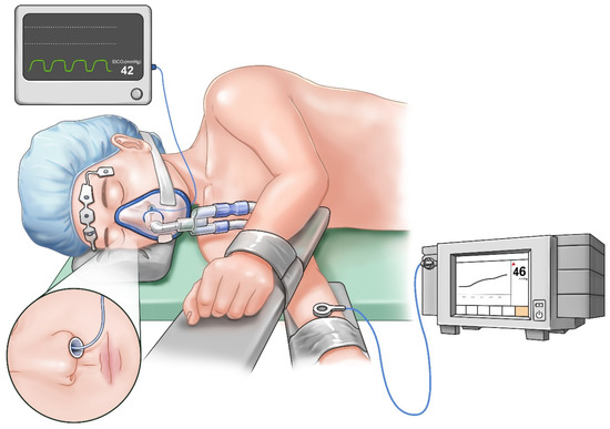 Once a satisfactory sedation level was achieved, a nasopharyngeal airway was inserted. PetCO2 monitoring was performed using an infrared CO2 analyzer (Avance CS2, GE Healthcare, Madison, WI, USA) by inserting a sample line into the nasopharyngeal airway to minimize the potential under-detection of exhaled gas due to airway obstruction (Figure 1). The radial artery on the non-operated side was cannulated to monitor continuous arterial blood pressure and sample arterial blood for gas analysis. PtcCO2 was measured using a TCM4TM device (Radiometer, Copenhagen, Denmark). The transcutaneous monitoring technique was standardized by applying a probe on the forearm ipsilateral to the non-operated lung in the lateral decubitus position (Figure 1). Before placement, the device was calibrated ex vivo as per the manufacturer’s recommendations. Then, the skin surface where the electrode was placed was swabbed with alcohol to facilitate disc adhesion. Subsequently, the probe was mounted on the electrode with the working temperature set to 42 °C to arterialize the capillary blood flow in the skin. The subsequent in vivo calibration was based on the results of the first ABGA performed after a 10-min equilibration period from the time of the placement of probe on the patient for stabilization of the measurement [14,15].