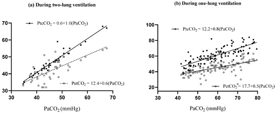 Correlation of PtcCO2 and PetCO2 with PaCO2 during (a) two-lung ventilation and (b) one-lung ventilation. PetCO2, end-tidal carbon dioxide partial pressure; PtcCO2, transcutaneous carbon dioxide partial pressure; PaCO2, partial pressure of arterial carbon dioxide.