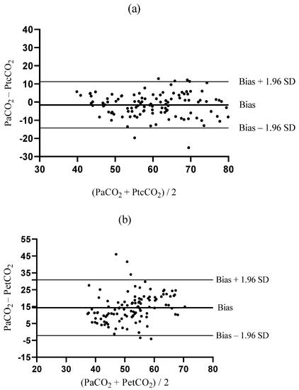 Bland–Altman plots comparing the agreement between (a) PaCO2 and PtcCO2 and (b) PaCO2 and PetCO2 during one-lung ventilation. PetCO2, end-tidal carbon dioxide partial pressure; PtcCO2, transcutaneous carbon dioxide partial pressure; PaCO2, partial pressure of arterial carbon dioxide; SD, standard deviation.