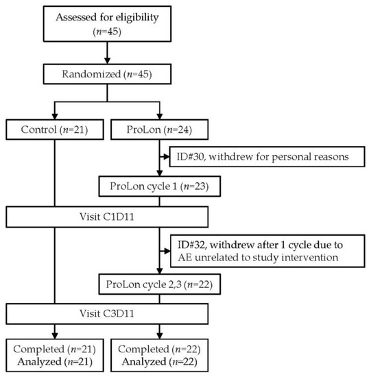 Overall, the ProLon intervention was well tolerated. The adverse effects reported during the study were not deemed by the investigators to be serious events and were not deemed to be associated with the intervention. They included one case of each of the following: left-hand paresthesia, left leg pain, arthralgia, pyelonephritis, and knee ligament rupture, all of which resolved.