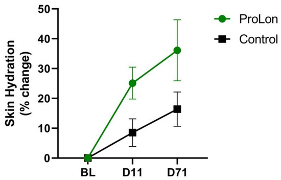 When assessing the percent increase in skin hydration, there was a significantly greater increase in the treatment group (25.1%) relative to the control (8.52%) at day 11, which corresponds to five days after completing the first ProLon cycle and after the resumption of subjects’ habitual diet (p = 0.024). Additionally, there was a statistically significant increase in percent change for skin hydration at both day 11 and day 71 in the treatment group relative to baseline (p = 0.00013 and p = 0.02, respectively). However, in the control group, a statistically significant increase was only observed at day 71 compared to the baseline (p = 0.0098) (Figure 2).
