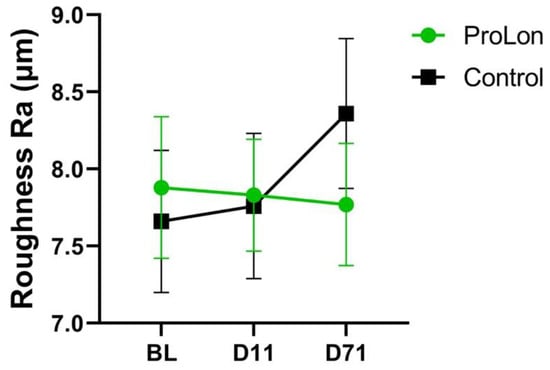 Skin texture, as determined by mean roughness (Ra), did not exhibit a significant change in the treatment group at day 11 or at day 71 relative to baseline. However, mean roughness was found to increase in the control group significantly at day 71 relative to baseline (p = 0.032) (Figure 3).