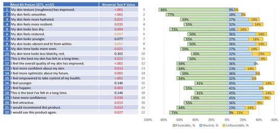 After completion of 3 ProLon cycles, subjects in the intervention group reported a significant improvement in various aspects of skin health, including (1) skin texture (p < 0.001), (2) smoothness (p < 0.001), (3) hydration (p = 0.021), and (9) skin tone evenness (p = 0.021), along with other skin improvements presented in Figure 4. In addition, there were significant improvements in some aspects of mood and self-perception (Figure 4). Specifically, subjects in the treatment group reported significant improvements in feelings of (17) happiness (p = 0.003), (19) confidence (0.039), (15) empowerment to take control of their health (p < 0.001), and (14) optimism about the future (p = 0.002).