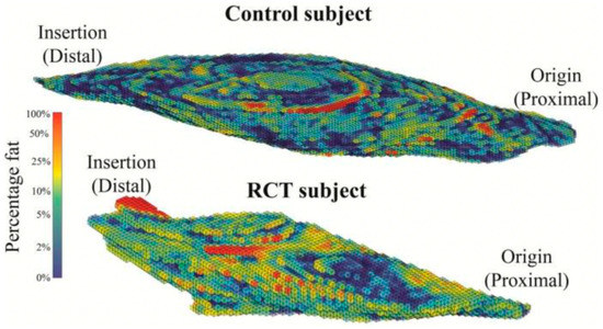 - Santago, A.C.; Vidt, M.E.; Tuohy, C.J.; Poehling, G.G.; Freehill, M.T.; Jordan, J.H.; Kraft, R.A.; Saul, K.R. Quantitative Analysis of Three-Dimensional Distribution and Clustering of Intramuscular Fat in Muscles of the Rotator Cuff. Ann. Biomed. Eng. 2015, 44, 2158–2167. [Google Scholar] [CrossRef] [PubMed]