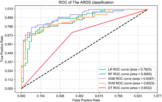 To further elaborate on the model performance, the evaluation metrics of accuracy, precision, recall, and F1 score (Table 2) were included in this work to compare the five models’ prediction effects. When compared, XGB showed the best predictive performance for ARDS with the highest accuracy (0.84), the highest precision (0.86), the highest recall (0.81), and the highest F1 score (0.83), while RF was the next best.